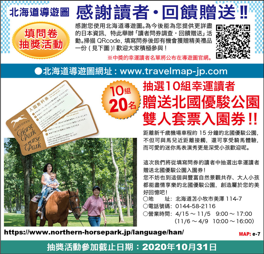 ※抽獎活動報名已截止。即日起至2020年10月31日,只要填寫「讀者調查問卷」,就有機會抽選獲贈北國優駿公園雙人套票入園券!!