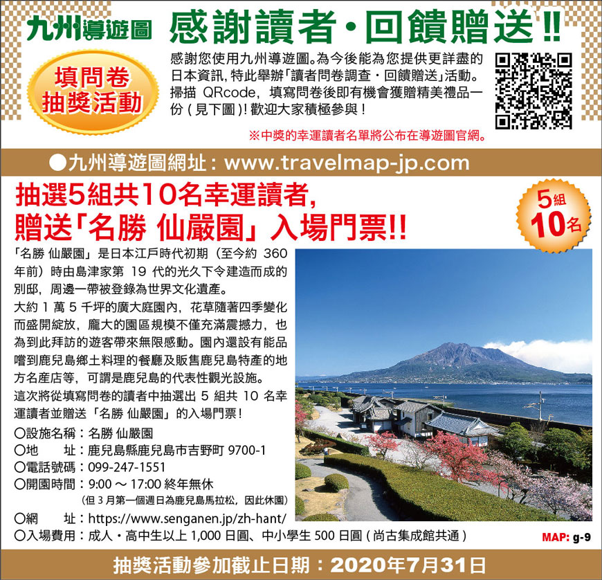 ※抽獎活動報名已截止。即日起至2020年7月31日,只要填寫「讀者調查問卷」,就有機會抽選獲贈「名勝 仙嚴園」入場門票!!